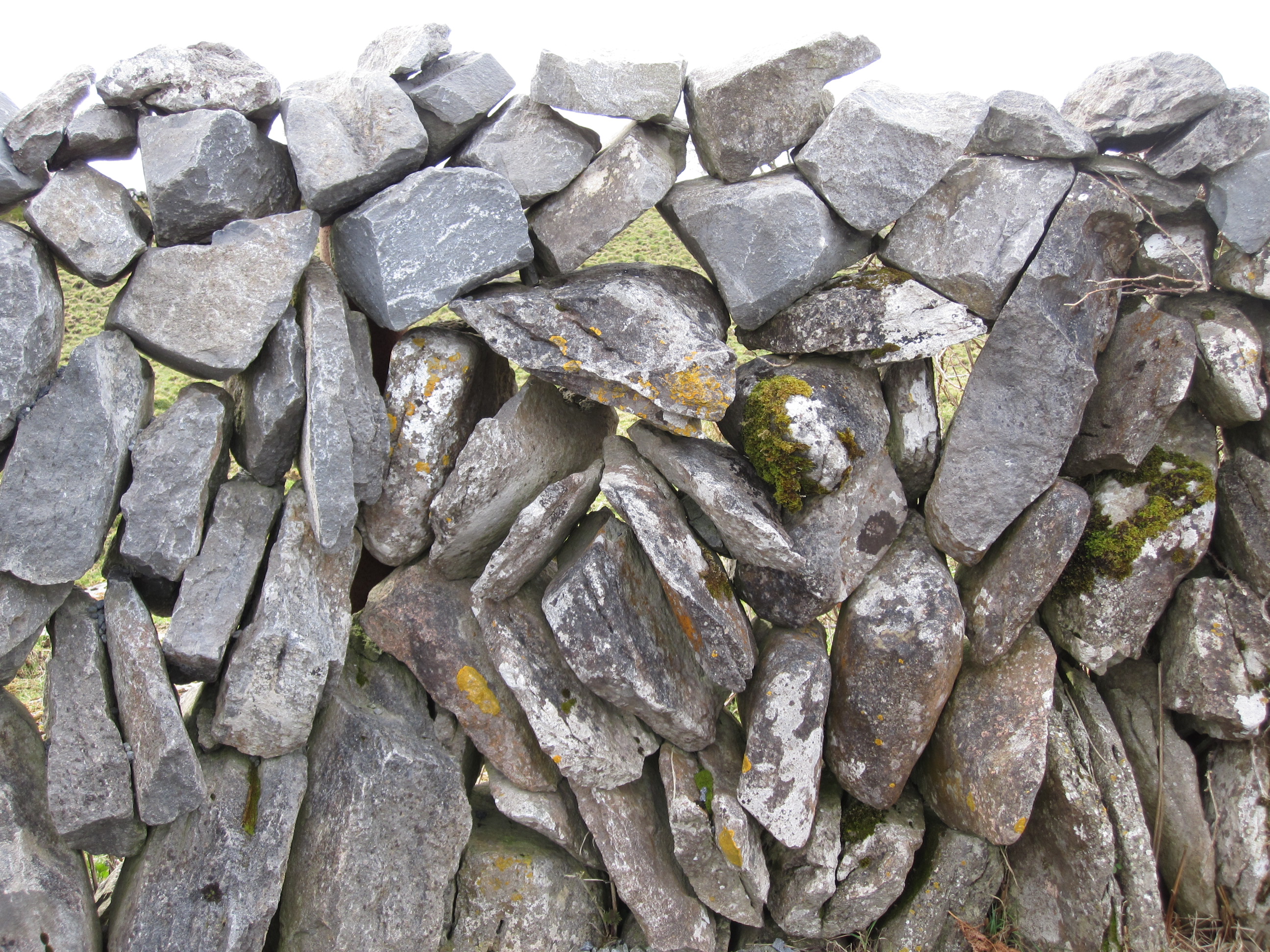 Why are they called dry stone walls? Uh, stones stacked into a wall, with nothing wet like mortar, mud, or cement to hold it together.