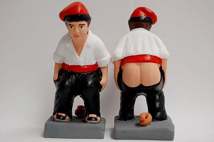Yes, you read that right.  These Catalan nativity scenes all include one figurine of a man squatting down with his pants around his ankles, right in the middle of doing his business, and most of the statues even have a little bit of statue poo right there below his bare butt.  These figures are called caganers, which translated into English means, “the defecator,” or, translated into middle school language – “dude pooping.”