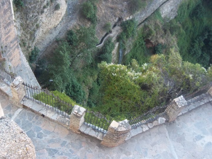 In her own words: This here is a picture looking down the gorge by the the old Puente Nuevo bridge in Ronda, Spain. I took this picture because not only did it show the side of the bridge kinda on the left side of the picture but it also showed the rocks and the few levels till the bottom of the gorge. Also, being so high up inspired me to think of a creative way to show high up we actually are. The best thing I like about this picture is how you actually feel like you are standing there looking down and also the shape of the rock sides below.