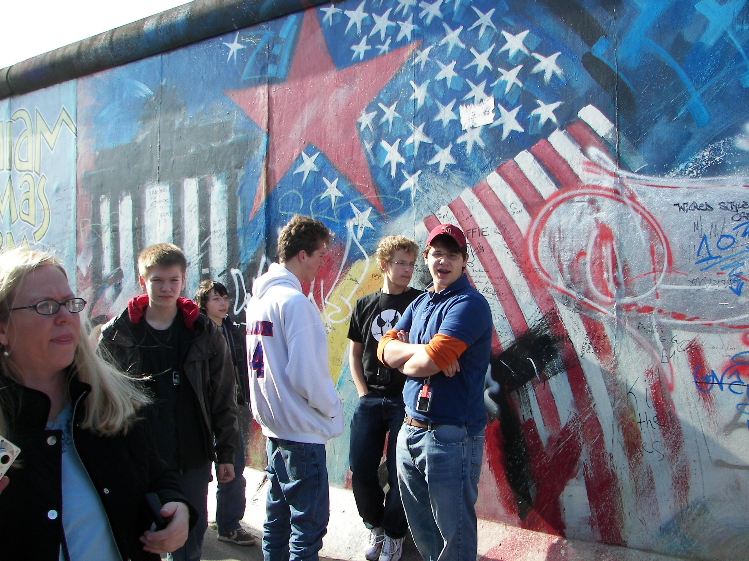 Berlin was the first city we visited, and it was incredible. We began with our tour director, Bernhardt, giving us a bus tour to give us an overview of the city and help us get our bearings. As we weaved our way through the streets, you could have gotten lost, but it was always easy to get an idea of where you were, because you could still tell – even 20 years after the Cold War had ended – where the dividing line between East and West Berlin was. The wall was gone in most places, but the East side was all drab, boring buildings built by the communist regime, while the West side was loaded with character – older buildings, churches, decoration. Eventually we got to stop and get out near one of the remaining sections of the wall. It was surreal for people my age and older to be standing there, having grown up during the Cold War. The Wall was always this dark symbol of evil in my mind, but now it’s really cool. The longer section we visited was filled with murals, dedicated to peace, painted by artists from all over the world. I could have walked down the sidewalk all day taking pictures of them, but there was tons more to see.